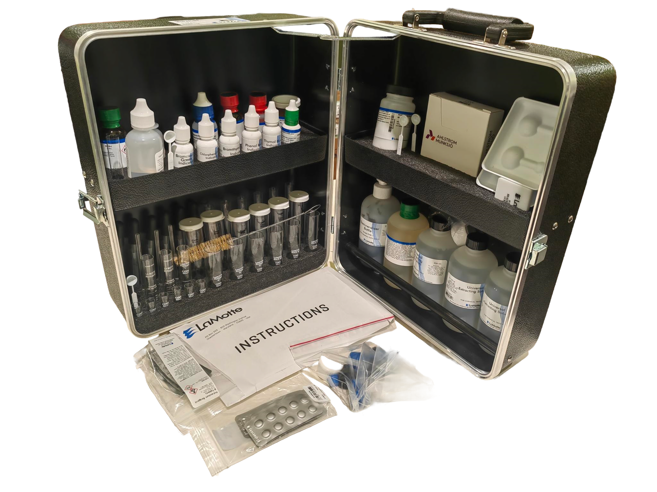 Почвенные лаборатории LaMotte серии STH созданы специально для полевых условий/. Все приборы, материалы и реагенты прочно и надежно закреплены в ударопрочном кейсе. Каждый комплект содержит упрощенные и полные инструкции по приготовлению образцов и проведению анализа, а также Руководство по проведению анализов почвы лаборатории LaMotte серии STH.
